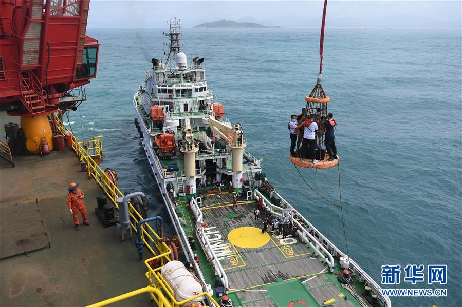 7月10日,工人乘船抵達(dá)位于南海北部海域的勘探三號(hào)鉆井平臺(tái)附近,再乘坐由吊機(jī)牽引的吊籠登上鉆井平臺(tái),開啟他們當(dāng)期在勘探三號(hào)平臺(tái)上的輪值工作。新華社記者蒲曉旭攝