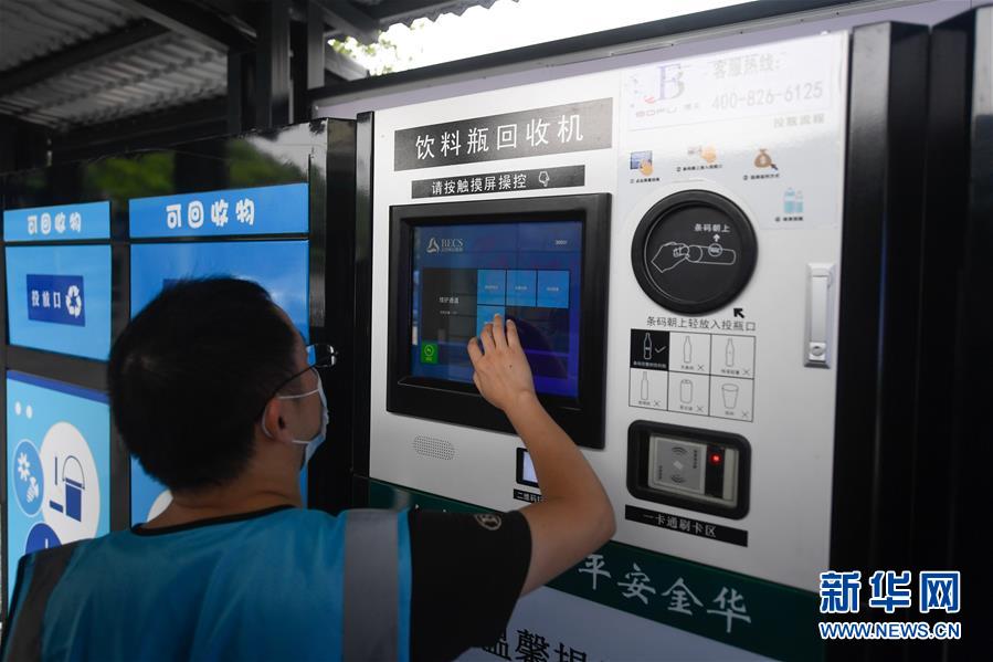 網(wǎng)格員在金華市金東區(qū)東孝街道一處垃圾分類投放點操作飲料瓶回收機(7月16日攝)。近年來,浙江省通過創(chuàng)新宣傳教育,多措并舉促進垃圾分類投放、收運及處置的良性循環(huán),引領垃圾分類成為城鄉(xiāng)居民的生活新風尚。新華社記者黃宗治攝。