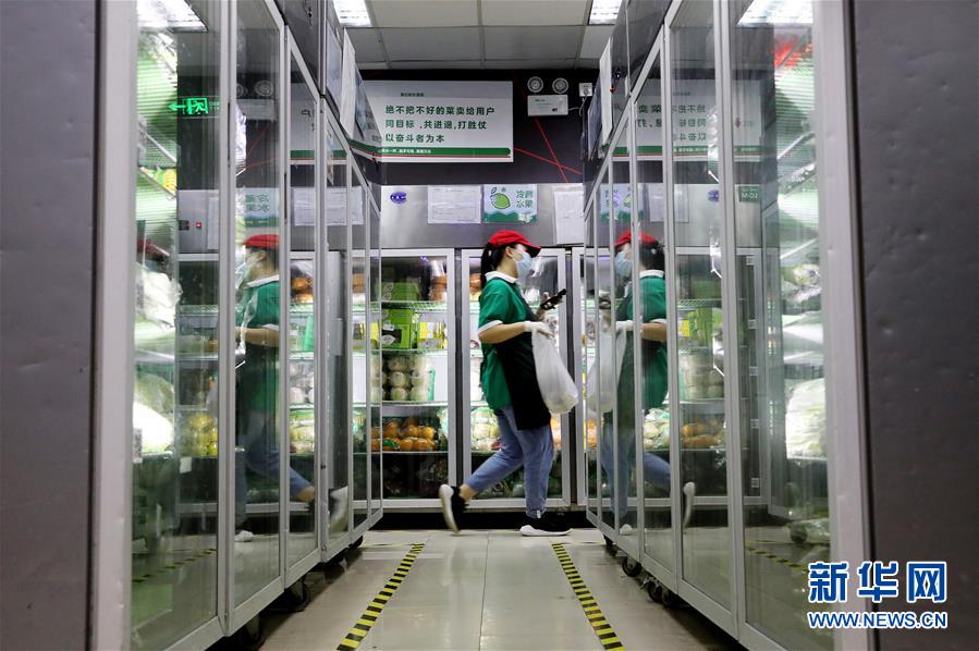 工作人員在叮咚買(mǎi)菜一家前置倉(cāng)內(nèi)為網(wǎng)絡(luò)訂單配貨(7月17日攝)。近年來(lái),在上海崛起了一批以盒馬、叮咚、拼多多為代表的在線經(jīng)濟(jì)新力量,在助力脫貧攻堅(jiān)、提升城市居民品質(zhì)生活方面發(fā)揮著重要作用。電商加持下的“云農(nóng)業(yè)”加速發(fā)展,一端為市民提供更便宜新鮮的農(nóng)產(chǎn)品,另一端讓山區(qū)的優(yōu)質(zhì)產(chǎn)品加速進(jìn)入城市餐桌,化解交通不便、農(nóng)產(chǎn)品滯銷(xiāo)等問(wèn)題。新華社記者方喆攝。