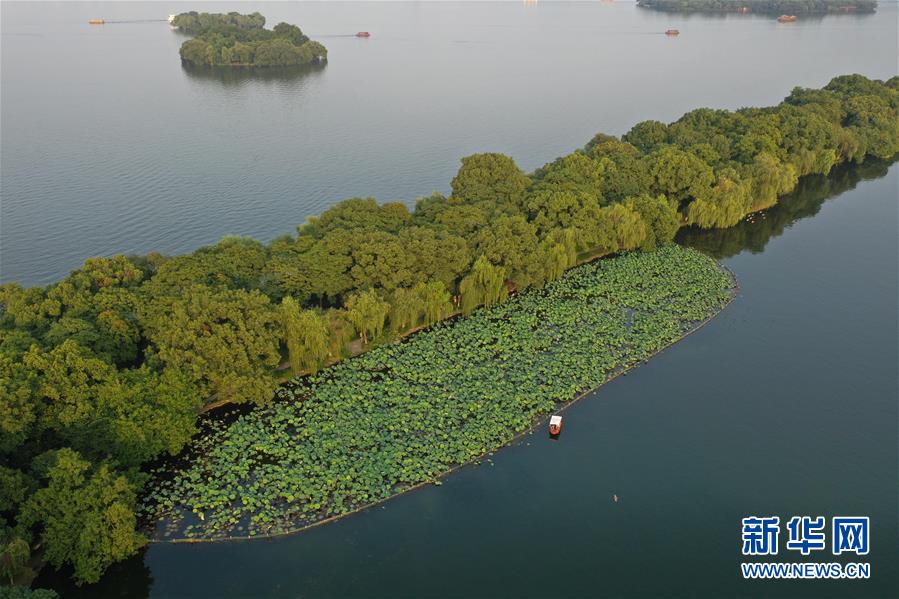 游客在西湖景區(qū)蘇堤附近觀賞荷花(6月30日攝,無人機照片)。新華社記者黃宗治攝。