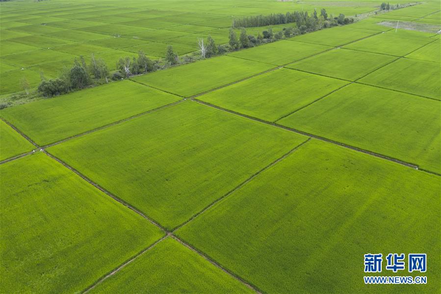 8月11日在撫遠(yuǎn)市拍攝的稻田(無人機(jī)照片)。時下,“華夏東極”黑龍江省撫遠(yuǎn)市的水稻長勢良好,蒼翠的稻田一望無際,猶如綠毯鋪在大地上。新華社記者謝劍飛攝。