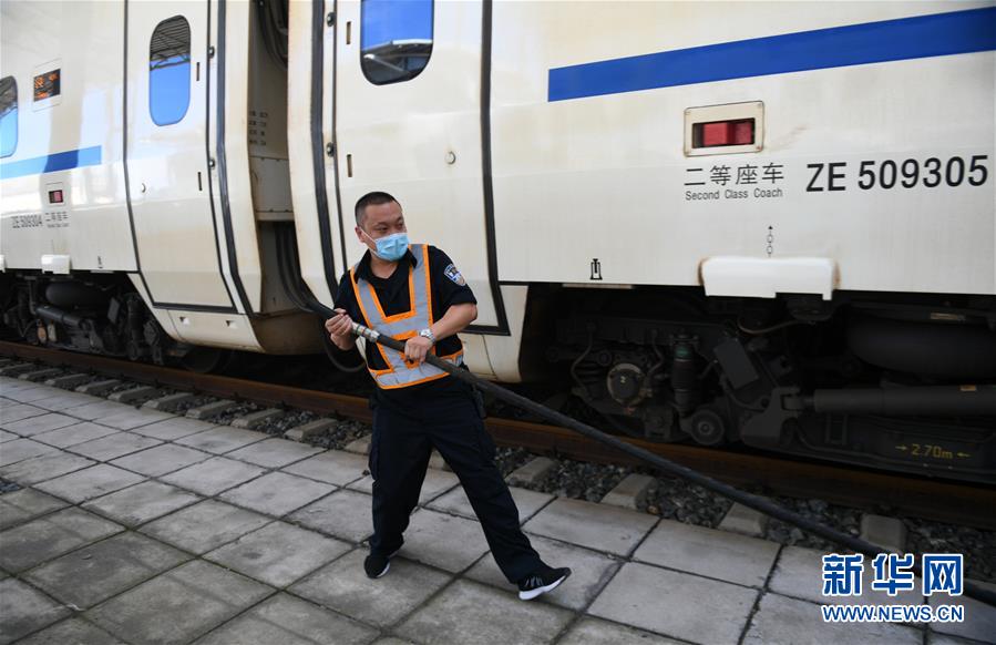 8月12日,長(zhǎng)春火車站客運(yùn)車間上水工常明為剛剛到站的一趟列車上水。新華社記者 林宏 攝