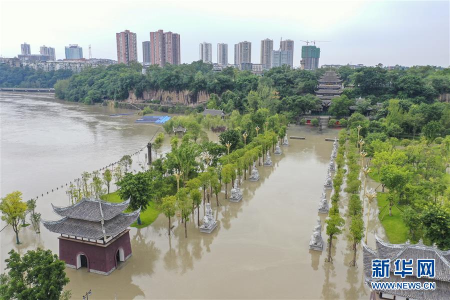 8月12日,重慶市潼南區(qū)大佛寺景區(qū),涪江洪水淹沒景區(qū)廣場(無人機照片)。受強降雨影響,涪江潼南段迎來過境洪水。截至12日下午5時,涪江潼南城區(qū)段最高水位238.5米,超警戒水位0.5米,低于保證水位(240米)。此次過境洪水導(dǎo)致潼南區(qū)部分場鎮(zhèn)低洼地段局部進水,約2700畝農(nóng)作物不同程度受災(zāi)。新華社記者 黃偉 攝