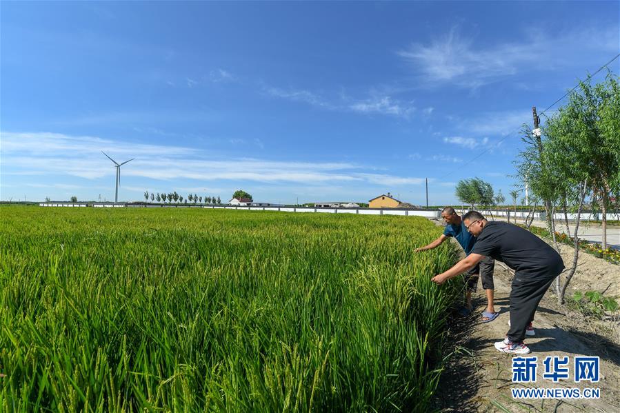 8月12日,在鎮(zhèn)賚縣黑魚(yú)泡鎮(zhèn)岔臺(tái)村,村民曲海波(左)和駐村第一書(shū)記姜宏寅在查看水稻長(zhǎng)勢(shì)。新華社記者 張楠 攝