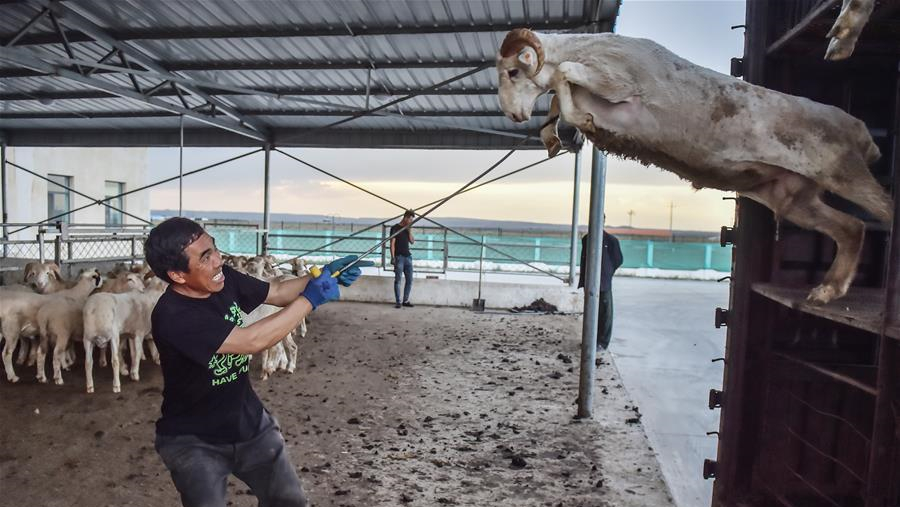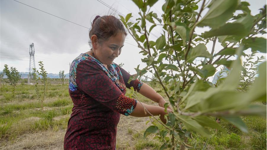 在新疆察布查爾錫伯自治縣一處生態(tài)扶貧林,當?shù)刎毨魧⑿藜敉甑臉渲丶椅股螅?月16日攝)。