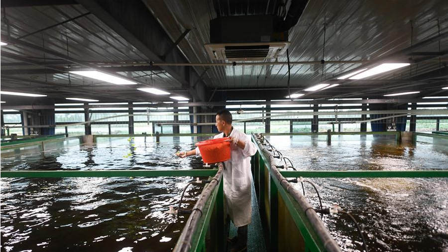 6月18日,技術人員在智能化循環(huán)水養(yǎng)殖車間進行管理。