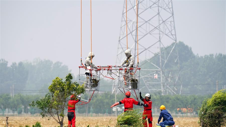 6月18日,直升機用吊籃把兩名檢修人員“吊”到有缺陷的特高壓線路上。