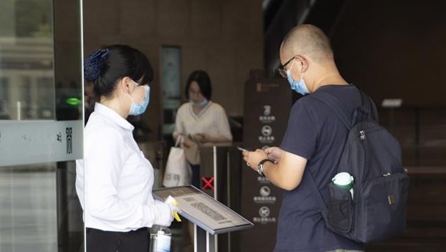5月17日,在江西省博物館新館,參觀者入館前測量體溫。