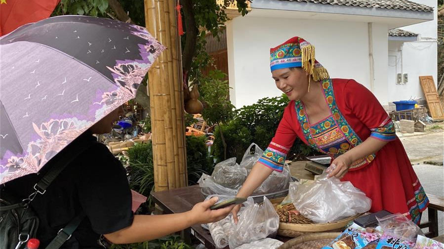 廣西恭城瑤族自治縣蓮花鎮(zhèn)紅巖村村民楊燕紅在家門口向客人推銷本地特產(chǎn)。