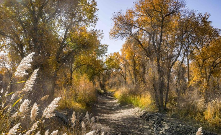 10月中下旬,靜靜的塔里木河中下游一片金黃。胡楊深處,條條小路蜿蜒綿長通向遠方,引人入勝。