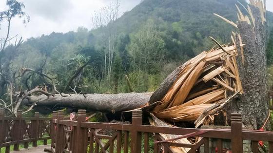 陜西漢中,4月4日夜,當(dāng)?shù)乜耧L(fēng)驟雨,電閃雷鳴,天氣異常,夫妻古樹被大風(fēng)刮到。