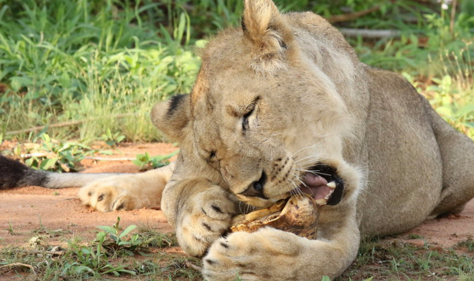肯尼亞獅子捉了只烏龜當(dāng)“零食” 啃不到肉肉好生氣!
