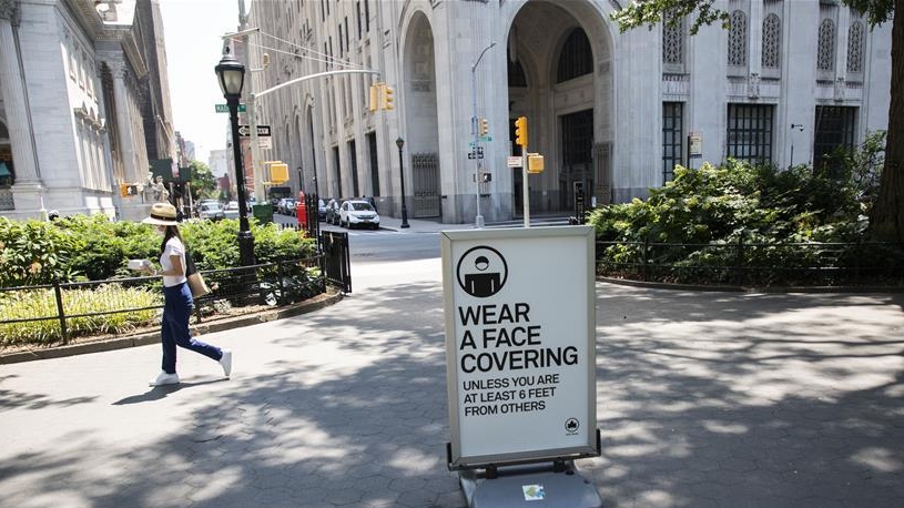 7月6日,行人走過(guò)美國(guó)紐約一處公園內(nèi)的提示牌,上面寫有防疫須知和公園管理規(guī)定。