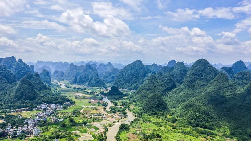 時值夏日,廣西桂林市陽朔縣景色宜人,青山綠草、藍天白云構(gòu)成一幅幅美麗的山水畫卷。