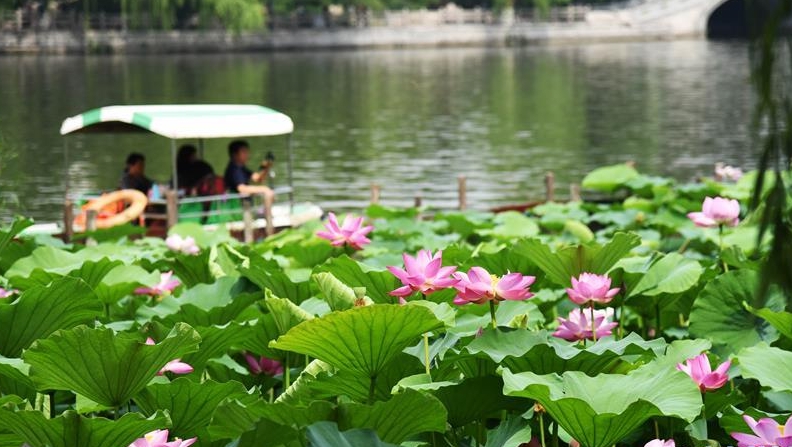 近日,山東濟南大明湖的荷花陸續(xù)綻放,吸引游客前來觀賞。