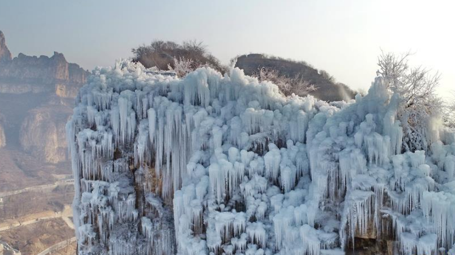 近日,河北省平山縣境內(nèi)的沕沕水景區(qū)出現(xiàn)冰瀑美景,形態(tài)各異的冰柱懸掛在山麓間,吸引游客前來(lái)觀(guān)賞。