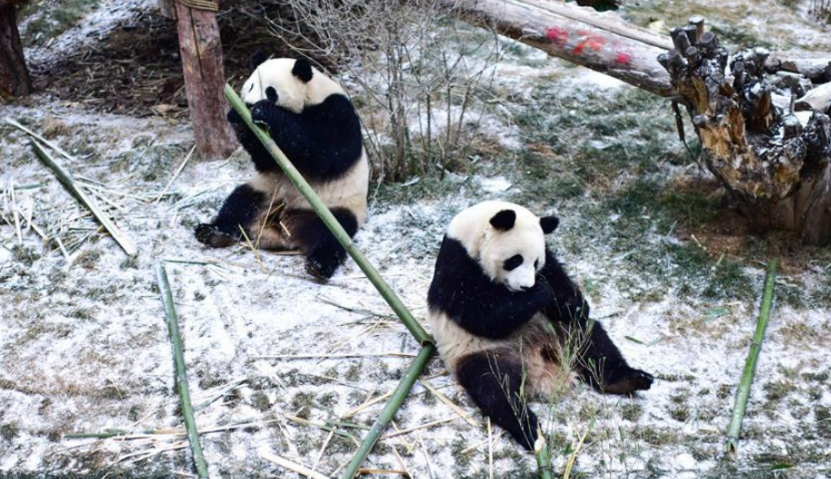 當(dāng)日,青海省西寧市迎來(lái)降雪,西寧熊貓館四只“萌寵”大熊貓?jiān)谘┨炖锵硎苤灾褡拥臉?lè)趣。