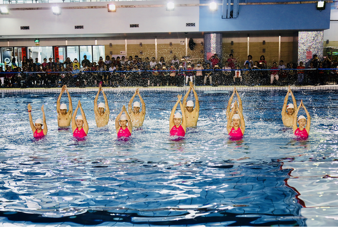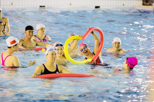 活動(dòng)伊始,來(lái)自廣州體育學(xué)院的水中健身操教練團(tuán)隊(duì)為大家?guī)?lái)了精彩的水中集體徒手操、水中集體太極、水中集體恰恰、水中集體健身棒操、水中集體深水操表演。接下來(lái)的體驗(yàn)時(shí)間,身著泳衣的學(xué)員們?cè)趯?zhuān)業(yè)教練的指導(dǎo)下進(jìn)行熱身活動(dòng)。十分鐘左右的熱身活動(dòng)結(jié)束后,學(xué)員們走下泳池踩著音樂(lè)的節(jié)拍于水中體驗(yàn)水中游戲、健身徒手操、手中太極等課程,學(xué)員們?cè)诮叹毜膸?dòng)下,熱情的學(xué)習(xí)跑、跳、拉伸等動(dòng)作,利用水的阻力、浮力和傳熱性進(jìn)行全身耗氧運(yùn)動(dòng)。