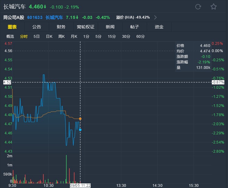 截至發(fā)稿,長城汽車報(bào)4.46港元,跌2.19%。(文文)