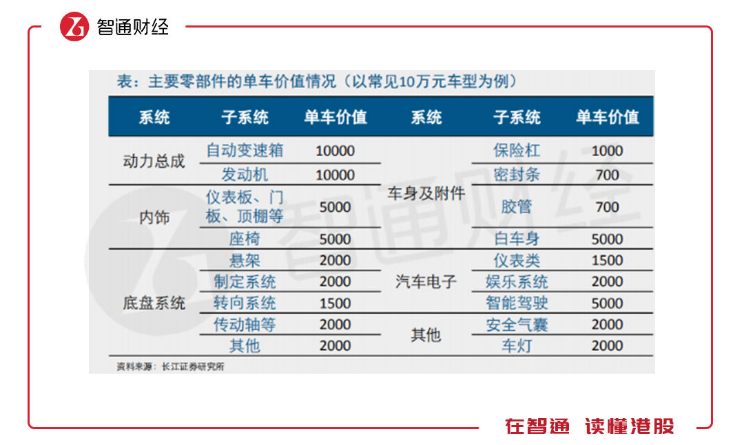 先看燃油車,按照長江證券的研究,以10萬元車型為例,各系統(tǒng)價值合計(jì)5.58萬元,動力總成占了35.8%,內(nèi)飾及汽車電子占33%,底盤占17%,車身及附件占13.3%。