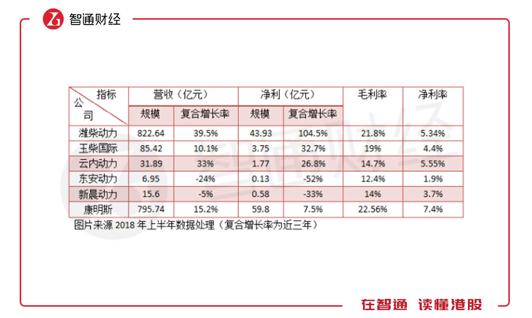 國內(nèi)的發(fā)動機(jī)供應(yīng)市場高度集中,前十大供應(yīng)占據(jù)了超過7成的份額,主要為柴油機(jī)供應(yīng),適用于商用車,龍頭濰柴動力(02338)市場份額最大。汽油機(jī)適用于乘用車,由于主要為內(nèi)供,市場數(shù)據(jù)較少。與國際龍頭康明斯相比,上半年國內(nèi)的柴油機(jī)企業(yè)賺錢能力還是較低的。