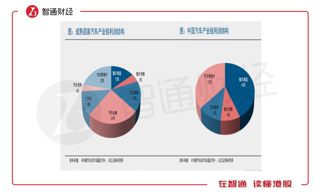 實(shí)際上,整個產(chǎn)業(yè)鏈各部分成長及盈利水平不一樣,未來利潤結(jié)構(gòu)變化也會不一樣。不過根據(jù)發(fā)達(dá)國家的成長路徑,整車及零部件肯定是要讓利給下游的,特別是輔助銷售環(huán)節(jié)的汽車租賃及汽車金融板塊。