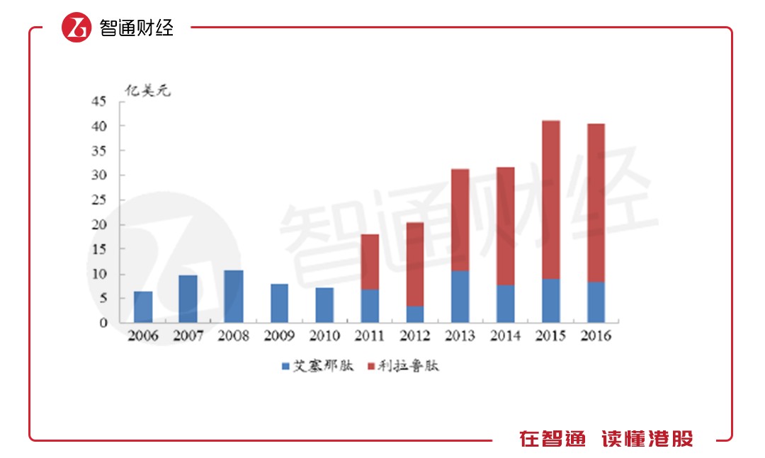 從2005年發(fā)展至今,全球已有6種GLP-1受體激動劑相繼獲批上市,整個GLP-1受體激動劑類藥物的全球市場規(guī)模已超過40億美元,2011-2016年的復(fù)合增長率超過15%。而艾塞那肽作為最早上市的GLP-1類似物,上市后銷售額快速增長,早在2008年就突破10億美元。