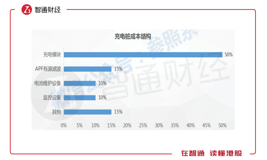 充電樁的上游是零部件的供應(yīng)商,主要為電池維護設(shè)備、充電模塊、監(jiān)控設(shè)備等,而充電樁的成本構(gòu)成中,充電模塊占比達50%,充電模塊、監(jiān)控設(shè)備及電池維護設(shè)備合計成本占比達到70%,是充電樁的核心成本。