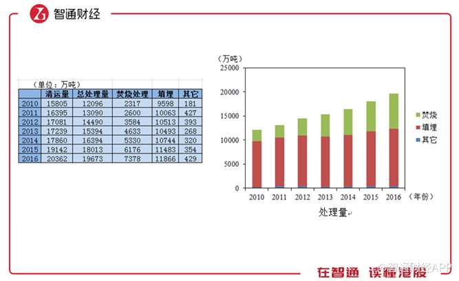 智通財(cái)經(jīng)APP統(tǒng)計(jì)到,2010至2016年,生活垃圾清運(yùn)量和處理量由15805、12096萬(wàn)噸增長(zhǎng)至20362、19673萬(wàn)噸,無(wú)害化處理率由76.5%增至96.6%,可見垃圾處理率得到了明顯提高。