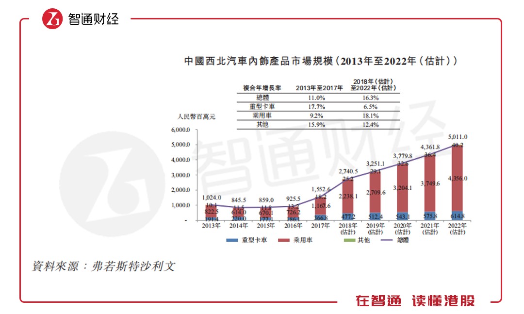 智通財經(jīng)APP進一步查閱天瑞招股說明書發(fā)現(xiàn),從行業(yè)來看中國汽車內(nèi)飾產(chǎn)品市場的總值由2013年的435.7億元增至2017年的620.4億元,復(fù)合年增長率為9.2%。估計市場規(guī)模將于2022年達到942.39億元,2018年至2022年期間的復(fù)合年增長率為8.4%。