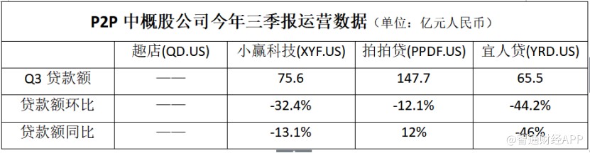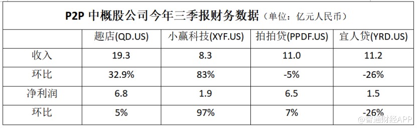 智通財(cái)經(jīng)APP觀察到,在披露三季報(bào)的P2P中概股公司中,趣店(QD.US)收入達(dá)19.3億元(人民幣,單位下同),環(huán)比增長(zhǎng)32.9%,同期凈利潤(rùn)為6.8億元,環(huán)比增長(zhǎng)5%;小贏科技(XYF.US)收入為8.3億元,環(huán)比增加83%,凈利潤(rùn)為1.9億元,環(huán)比增長(zhǎng)97%;拍拍貸(PPDF.US)收入為11億元,環(huán)比下跌5%,凈利潤(rùn)為6.5億元,環(huán)比增長(zhǎng)7%;宜人貸(YRD.US)收入為11.2億元,環(huán)比下跌26%,凈利潤(rùn)為1.5億元,環(huán)比下跌26%。