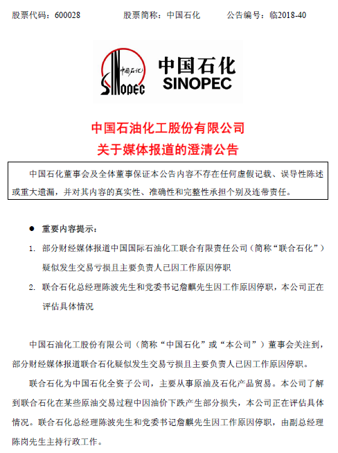 智通財(cái)經(jīng)APP獲悉,中國石化今日(12月27日)晚間在上交所發(fā)表公告稱,了解到聯(lián)合石化在某些原油交易過程中因油價(jià)下跌產(chǎn)生部分損失,公司正在評(píng)估具體情況。聯(lián)合石化總經(jīng)理陳波先生和黨委書記詹麒因工作原因停職,由副總經(jīng)理陳崗主持行政工作。此外,中國石化還表示,目前公司生產(chǎn)經(jīng)營(yíng)情況一切正常。(林雅蕓)