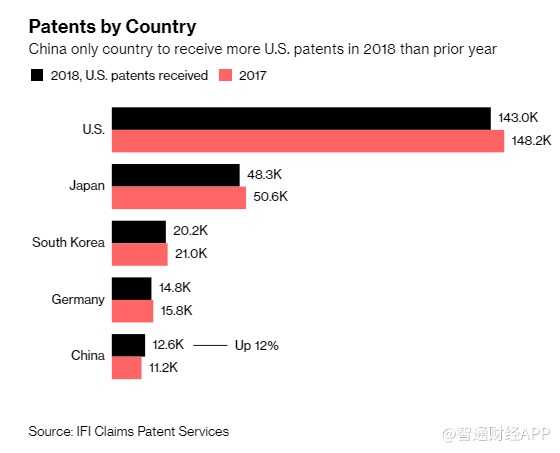 2018年,中國公司的發(fā)明獲得了12589項美國專利,同比增長12%,比十年前的1223項專利增長了10倍之多。美國在這一領(lǐng)域仍占主導(dǎo)地位,去年美國頒發(fā)的308853項公用事業(yè)專利中有46%是來自美國公司,其次是日本、韓國和德國的公司。