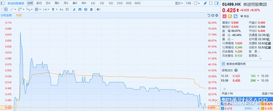 智通財經(jīng)APP獲悉,1月10日停牌的前進(jìn)控股集團(tuán)(01499)于24日復(fù)牌,股市反響劇烈,開盤十分鐘曾一度暴漲74.56%,不過隨后不斷滑落,截止16時45分,報港元0.425元(下同),較停牌日收盤價0.39元僅有9%的增幅。
