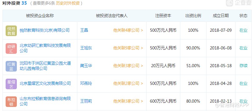 不過(guò),在內(nèi)地業(yè)務(wù)上,該公司今后的發(fā)展方向或也會(huì)出現(xiàn)一些變化,教育衍生品或?qū)⑹窃摴就顿Y方向,以該公司2018年投資的標(biāo)的來(lái)說(shuō),根據(jù)企查查的數(shù)據(jù),該公司投資成立的大部分是教育相關(guān)的服務(wù)。以下為企查查搜到的紅黃藍(lán)2018年投資成立的項(xiàng)目: