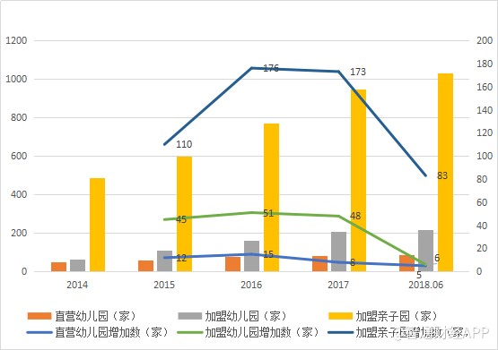 以下為紅黃藍(lán)2014年以來(lái)直營(yíng)及加盟幼兒園和親子園的情況: