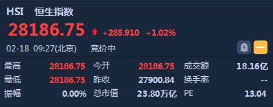 智通財(cái)經(jīng)APP獲悉,恒生指數(shù)開(kāi)盤(pán)漲285.91點(diǎn)或1.02%,報(bào)28186.75點(diǎn)。國(guó)企指數(shù)漲1.1%,報(bào)11057.72點(diǎn)。紅籌指數(shù)漲1.07%,報(bào)4499.71點(diǎn)。大市盤(pán)前成交18.16億港元。中美經(jīng)貿(mào)高級(jí)別磋商結(jié)束。1月份社會(huì)融資數(shù)據(jù)超預(yù)期。