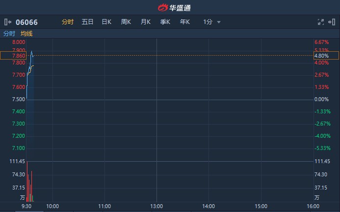 中信建投(06066)A股早盤打開漲停后又快速封板,H股跟隨上漲,截至9時(shí)37分,漲4.8%,報(bào)7.86港元,成交額額達(dá)3681萬港元。