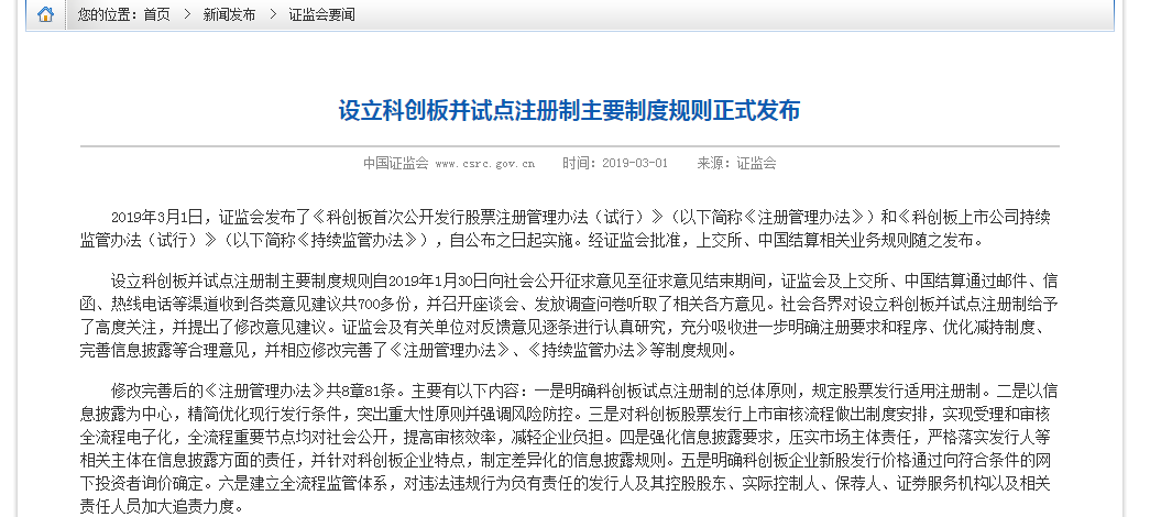 3月1日晚間,中國證監(jiān)會、上海證券交易所正式發(fā)布設立科創(chuàng)板并試點注冊制的主要制度規(guī)則。這表明,經(jīng)過一個月的意見征集,市場高度關注的科創(chuàng)板正式開閘。要點總結如下: