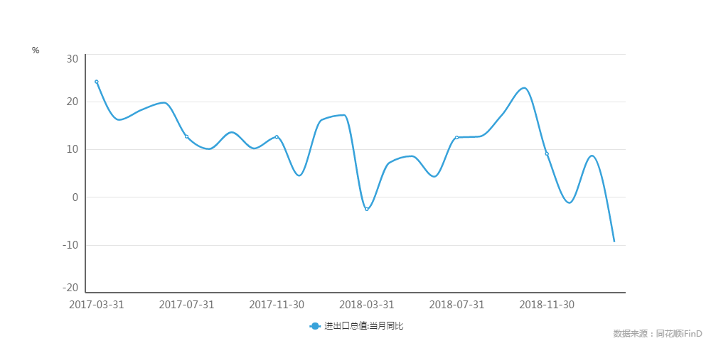 同時,進(jìn)出口數(shù)據(jù)持續(xù)低迷。中國海關(guān)總署3月8日公布數(shù)據(jù)顯示,2019年2月,我國進(jìn)出口總值2663.6億美元,同比增長-13.8%。其中出口1352.4億美元,同比增長--20.7%;進(jìn)口1311.2億美元,同比增長-5.2%。