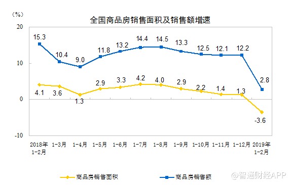 1-2月份,商品房銷售面積14102萬平方米,同比下降3.6%,2018年全年為增長1.3%。其中,住宅銷售面積下降3.2%,辦公樓銷售面積下降15.7%,商業(yè)營業(yè)用房銷售面積下降13.6%。商品房銷售額12803億元,增長2.8%,增速回落9.4個百分點。其中,住宅銷售額增長4.5%,辦公樓銷售額下降6.2%,商業(yè)營業(yè)用房銷售額下降9.4%。