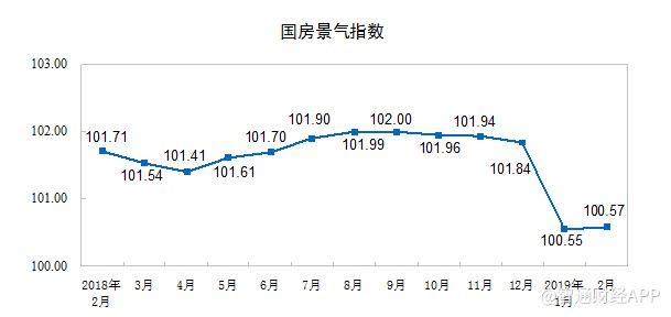 2月份,房地產開發(fā)景氣指數(shù)(簡稱“國房景氣指數(shù)”)為100.57,比2018年12月份回落1.27點。