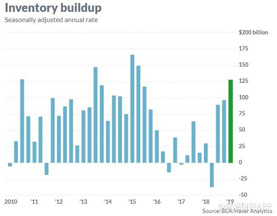 美國官方表示,1季度的增長超出了預(yù)期,部分原因是強勁的庫存增長。根據(jù)政府的數(shù)據(jù),本季度新增商品庫存320億美元,折合年率為1280億美元,推動了GDP增長約70個基點。
