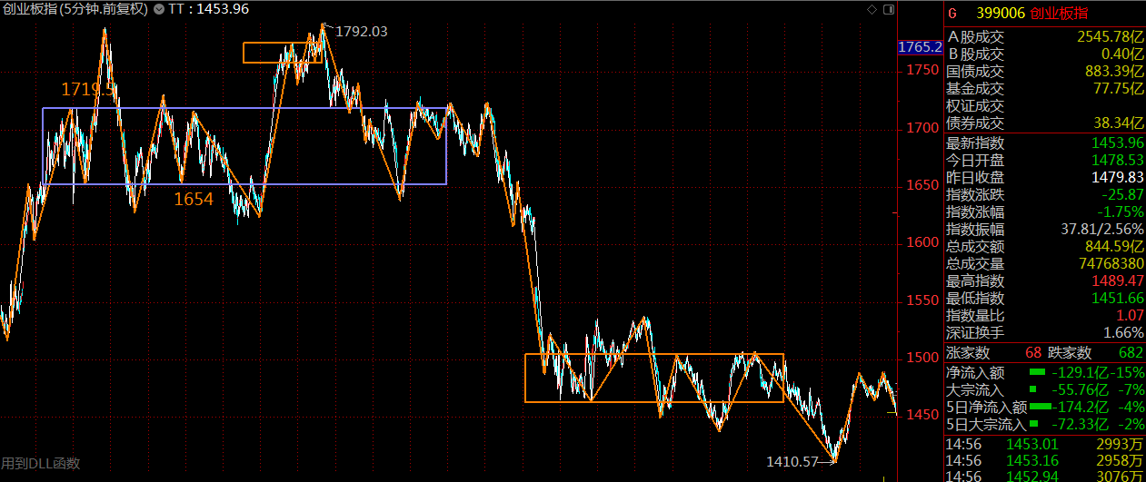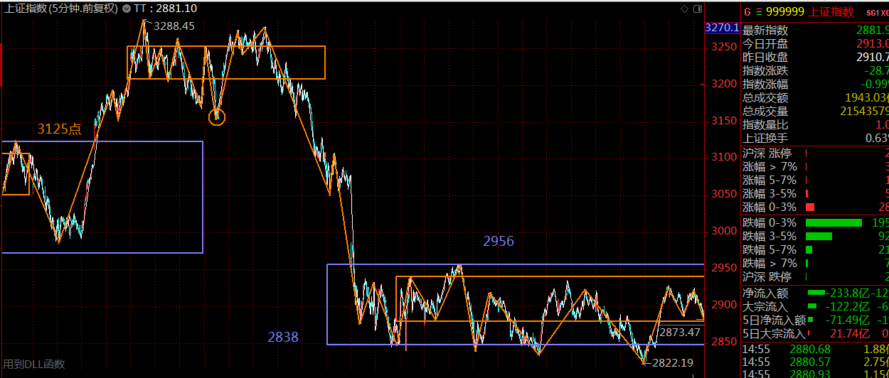下圖為上證指數(shù)五分鐘級(jí)別走勢(shì)結(jié)構(gòu)。目前下面五分鐘中樞已出現(xiàn)中樞擴(kuò)展的情況,即擴(kuò)展為藍(lán)色框線的三十分鐘中樞。目前來(lái)看,屬于中樞震蕩的走勢(shì)結(jié)構(gòu),關(guān)注接近2838點(diǎn)的盤(pán)整背馳機(jī)會(huì),以及接近2956點(diǎn)的壓力大小。本周初,指數(shù)可能還會(huì)繼續(xù)下探2938點(diǎn),在出現(xiàn)該中樞的三賣(mài)之前,低于2838點(diǎn),都是低吸的機(jī)會(huì)。