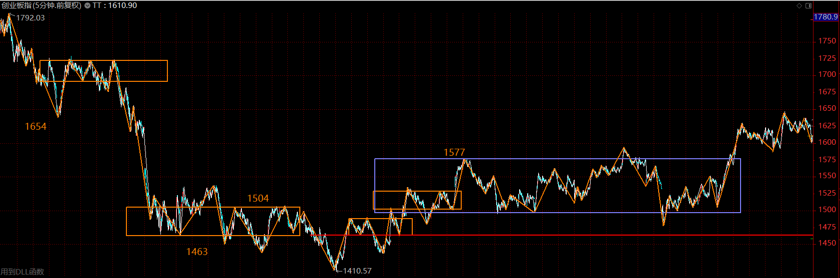 創(chuàng)業(yè)板指數(shù)依舊強勢,這里在構建30分鐘級別的三買,以1577點為界,如果回調不破,則這里將是創(chuàng)業(yè)板主升行情的起點。如若重新跌回中樞內部,則按中樞震蕩處理。創(chuàng)業(yè)板走勢要強于主板很多,后續(xù)行情多半仍然圍繞創(chuàng)業(yè)板展開。