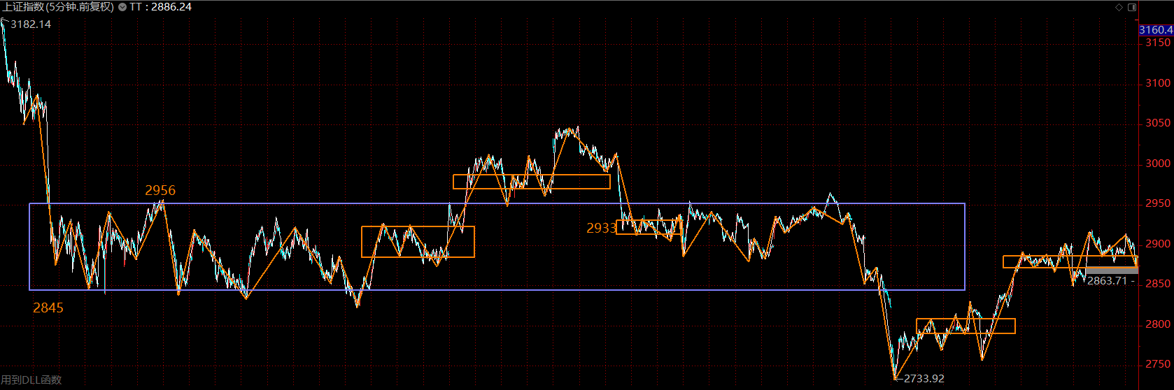 上證指數(shù)上周在這個位置做中樞擴展,將五分鐘上漲的第二個中樞擴展為三十分鐘級別的。這是強勢的一種表現(xiàn),市場在震蕩中消化拋壓。這里需關注大中樞的下軌2845點,跌破后,可能會帶來指數(shù)的二次探底,這將是絕佳的加倉點位,不跌破則市場隨時會上攻2950點。目前態(tài)勢下,應以持倉為主。