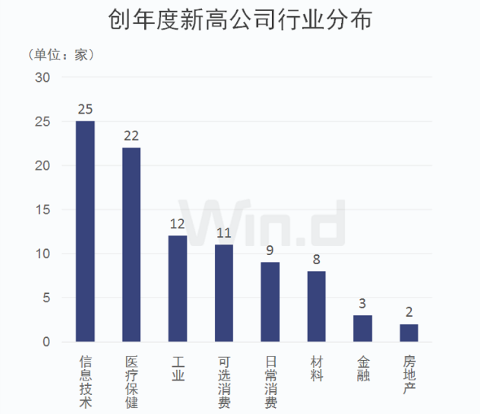 Wind統(tǒng)計(jì)顯示,有92家公司近3日最高股價(jià)創(chuàng)今年以來新高。從相關(guān)公司行業(yè)分布來看,信息技術(shù)類最多,有25家;醫(yī)療保健行業(yè)緊隨其后,有22家,工業(yè)、可選消費(fèi)均有超過10家公司??梢?,科技和生物醫(yī)藥類公司成為牛股聚集地。