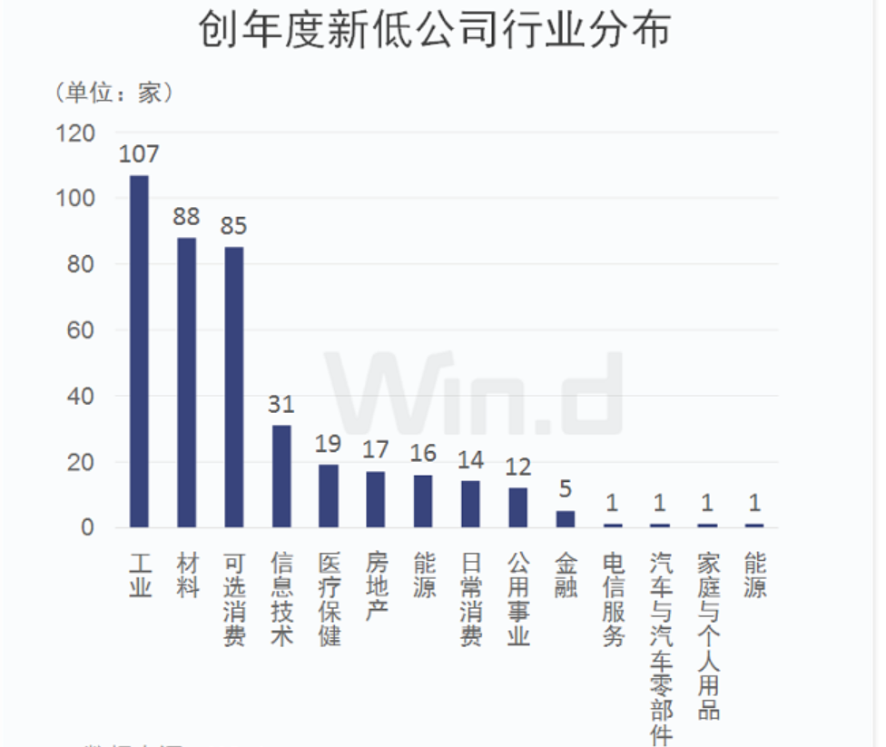 Wind統(tǒng)計(jì)顯示,有395家公司近3日最低股價(jià)創(chuàng)今年以來新低。從相關(guān)公司行業(yè)分布來看,工業(yè)最多,有107家,材料和可選消費(fèi)均有超過80家??梢?,雖然股指整體上漲,但傳統(tǒng)工業(yè)、材料領(lǐng)域投資者普遍不太看好。