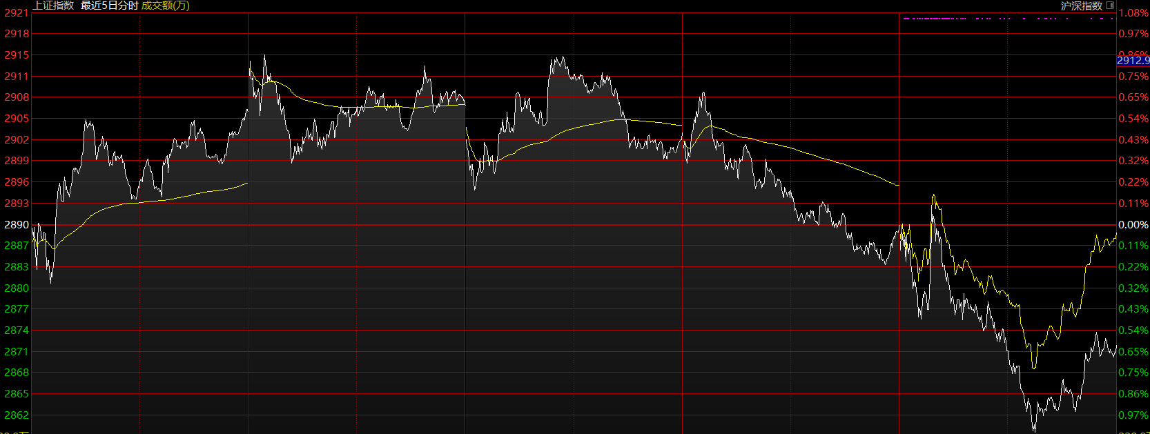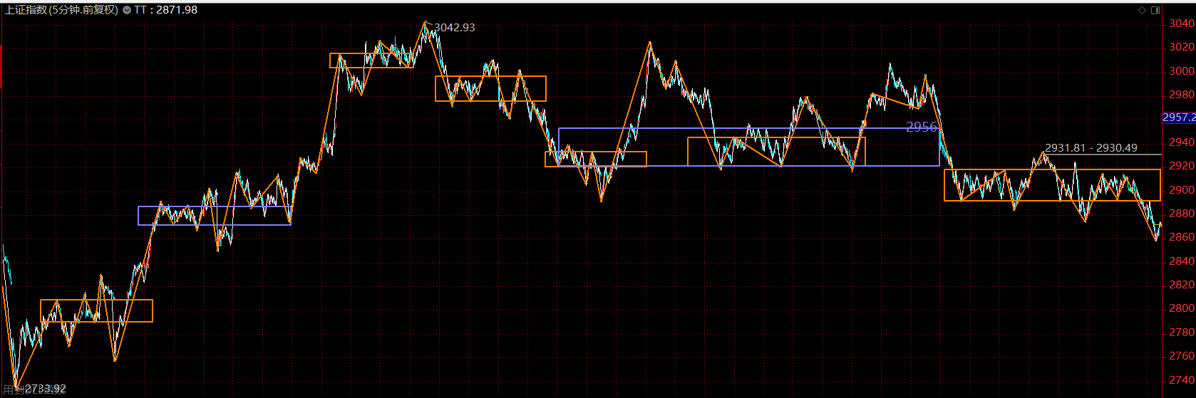 上證指數(shù)上周在等待中樞擴展完成后破位下跌,破位力度比較小,而對結構分解后發(fā)現(xiàn),這次大中樞的盤整背馳,第一段以五分鐘趨勢的形式完成,第二段以盤整的形式完成,且已進入了尾聲。因此,料此輪主跌段不會太久,繼續(xù)維持在前序中樞下軌2850附近企穩(wěn)的判斷。