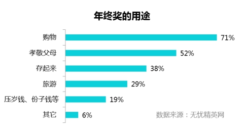 工作生活開支高,職場精英中房奴的比例也很高,很多人指望著用年終獎來購置一些大額的物品,或是用于平日不舍得的支出,犒勞一年辛苦工作的自己。同時,年終獎的發(fā)放時間也多在年底臨近春節(jié),是一年中開支最大的時候,過年回家的交通費、買衣物、孝敬父母,拜年禮、假期出游、給小輩的壓歲錢累積支出非常可觀,年終獎是職場人過年的“救命錢”。